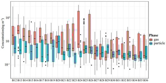 The distribution of B12~B36 in gas-phase and particle-phase. The center line of each box is the median of the data, the top, and bottom of the box are 75th and 25th percentiles, and the top and bottom whiskers are 90th and 10th percentiles.