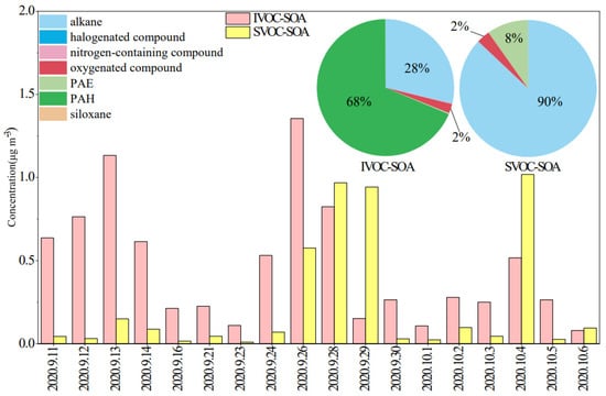 Concentrations of oxygenated compounds (alkanols and fatty acids) were 0.22 μg m−3 (19.57%), lower than alkanes and PAHs, which should not be ignored. 2 alkanols and 4 fatty acids were measured, which may be related to cooking emissions []. PAEs, siloxanes, and some halogenated compounds were also known as VCPs. Despite conventional emissions such as vehicle exhaust, VCPs have become an important unconventional source of SOA [,,]. However, halogenated compounds take up only 5.6% part of the total IVOCs mass while PAEs and siloxanes with a proportion of 4.2%. Speciated SVOCs, alkanes, PAEs, oxygenated compounds, and PAHs accounted for 0.10 μg m−3. Alkanes took up nearly 80% of SVOCs, while the rest part divided equally between phthalates, oxygenated compounds, and PAHs.