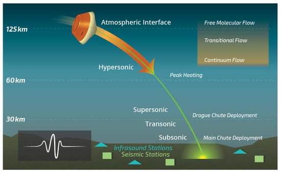 SRCs enter the atmosphere at a very shallow angle, typically 12° or less. The transition from free molecular flow to the lower transitional flow regime and finally the continuum flow regime is commonly accompanied by the initiation of shock waves and the formation of luminous phenomena along its path. Their flight through the atmosphere is initially hypersonic, and then transitions to supersonic, followed by transonic and dark flight regimes before soft landing (Figure 1). This progression in a single re-entry allows for an unparalleled opportunity to investigate different flight stages and assess how acoustic emissions might vary accordingly as well as to conduct comparative studies with other sensing methodologies. Variations in infrasound signal amplitude and frequency content can be used to infer the point of origin of the shock wave, its propagation and attenuation, and atmospheric effects [,]. These observations contribute to our understanding of the complex processes occurring as the spacecraft rapidly decelerates and undergoes thermal and mechanical stresses.
