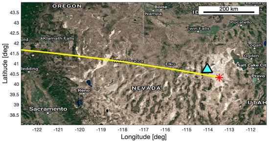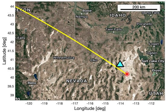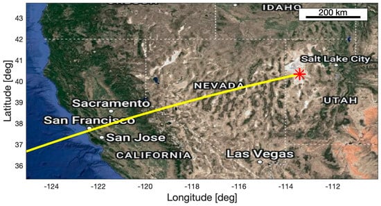 The OSIRIS-REx asteroid sample return mission was launched in 2016 with the aim to collect samples from the near-Earth asteroid Bennu and deliver those samples back to Earth in pristine condition. Bennu was chosen because it is a readily accessible primitive, carbonaceous asteroid, and also one of the most potentially hazardous known near-Earth objects [,,,]. In terms of design (see Table 1) and planned re-entry, the OSIRIS-REx SRC is identical to the Stardust SRC, and the acoustic signatures are supposed to be similar. The re-entry will consist of several flight phases, including the hypersonic, transonic, and dark flight (see Figure 1). Landing is planned for 24 September 2023 at approximately 14:30 UTC over the region enclosed by an 80 km long and 20 km wide ellipse at UTTR [,]. The nominal ground track is shown in Figure 12 (M. Moreau, NASA, personal communication).