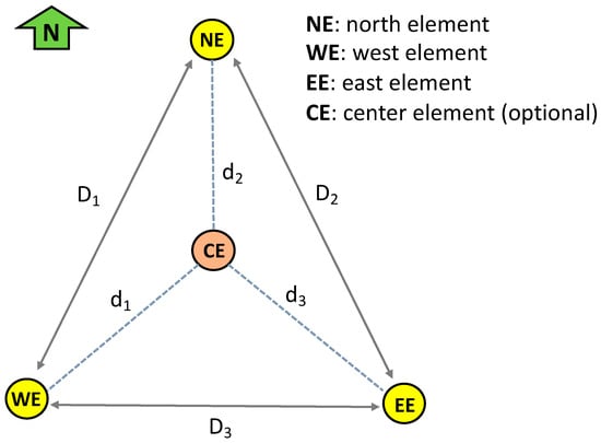 A dedicated observational campaign, led by the Los Alamos National Laboratory (LANL) group, consisted of deploying a three-element ground-based infrasound array in Wendover, Nevada (40.7154° N, −114.0357° E) (Figure 2). Simple infrasound array configurations include three or four elements (sensors) in a triangular formation, as shown in Figure 3. Three-element arrays do not have a center element. The reason microbarometers are set up in an array is to determine the wavefront velocity and direction of arrival. Outer (D) and inner (d) distances between the elements are generally optimized for the predicted wavelength of a given source [].