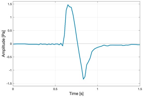 The team observing the re-entry heard two distinct sonic booms, but another team member, located nearby, heard only one. The subsequent signal analysis indicated that the main hypersonic boom arrival came at approximately 15:57 UTC, with a delay of 2–4 min (the latter value corresponds to the point of peak heating). The signal recorded at Channel 1 is shown in Figure 4; it exhibits the typical N-wave signature, associated with a ballistic shock. ReVelle et al. [] concluded that the signal source altitude was 35.5–54.4 km. Trace velocity of the signal was 0.583 km/s. The authors noted that they could not utilize the standard zero-crossing technique to measure the dominant signal period because the results were unreliable; instead, thus they obtained the measurement through fast Fourier transform (FFT) of the signal. The signal properties were as follows: maximum amplitude (Amax) was 3.99 ± 0.16 Pa, peak-to-peak amplitude (Ap2p) was 7.26 ± 0.32 Pa, dominant signal period (P) was 0.45 ± 0.03 s, and dominant signal frequency was 2.25 ± 0.14 Hz. These are also listed in Table 2, alongside the Stardust signal measurements.