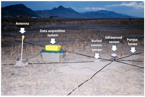 The seismo-acoustic observational campaign effort was led by the same LANL group that also led the Genesis deployment [,]. The Stardust SRC re-entry on 15 January 2006 was monitored by a four-element ground-based infrasound array accompanied by two co-located seismometers at the airport in Wendover, Nevada (40.7154° N, −114.0357° E) (Figure 5). One seismometer was buried beside the center element, and another one beside the north element. The infrasound array was deployed at a horizontal distance of ~33 km from the nominal trajectory, and it included the same complement of infrasound instruments used for the Genesis observation, with the exception that this array had four Chaparral sensors (Figure 5), and a smaller aperture. The array element separation distances for Genesis and Stardust observations are listed in Table 2 (also see Figure 3). The sampling frequency was 100 Hz []. An annotated photo of the center element and the related equipment is shown in Figure 6.