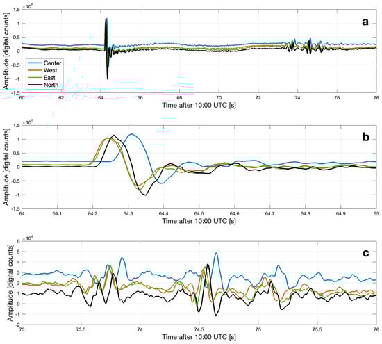The entire observing team on site heard a muffled hypersonic boom generated by the Stardust re-entry. Two infrasound signals were detected (Figure 7a), the primary arrival at 10:01:04.2 UTC (Figure 7b), and the secondary arrival (Figure 7c) at 10:01:13.5 UTC (Table 3). The main infrasonic arrival signal parameters were as follows: the peak amplitude was 1.15 ± 0.10 Pa, the peak-to-peak amplitude was 1.80 ± 0.19 Pa, the dominant signal period was 0.20 ± 0.01 s, and the dominant signal frequency was 5.00 ± 0.25 Hz (also see Table 2). The source altitude was estimated at 40 km. Later airwave arrivals in the 1–10 Hz frequency range were also detected and, after detailed analysis, attributed to the ground-to-air coupling []. Stardust not only served as a proxy to meteors but also provided the first-ever calibrated measurement of acoustic–seismic coupling efficiency for such an object []. The yield estimate, using the AFTAC wave period-based relation, was estimated at 1.206 × 10−2 tons of TNT equivalent, and only 6.703 × 10−4 tons of TNT equivalent based on the line source (see ReVelle et al. [] for further details).