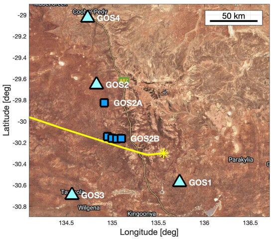 A large complement of instruments was deployed in anticipation of the Hayabusa 1 SRC re-entry [,,]. These included both still and video cameras, infrasound sensors, (audible range) acoustic sensors, and seismometers (Table 1). Figure 9 shows the geographical locations of various deployment sites alongside the Hayabusa 1 SRC ground track, as published by Yamamoto et al. []. Optical observation sites are denoted as GOS1, GOS2, GOS3, and GOS4. Infrasound, acoustic (audible range), and seismic sensors were situated at GOS2. A single Chaparral Physics (Model 2) infrasound sensor was installed at GOS2 and another one at GOS2B. A three-element array comprised of Chaparral Model 2.5 sensors was deployed at GOS2A. Soaker hoses were used to reduce the local wind noise. An audible sound recorder was placed at GOS2. Vertical-component-only seismometers (Hakusan, SG820) were installed at GOS2 (5 units), GOS2A (6 units), and GOS2B (7 units), while three-component Sercel (formerly known as Mark Products) L-28-3D seismometers were installed at GOS2 and GOS2A (one unit at each site). Further details are available in Yamamoto et al. [] and Ishihara et al. [].