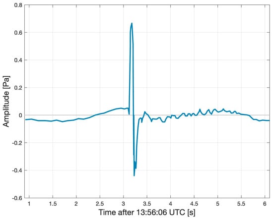 The first luminous appearance of Hayabusa was at an altitude of 110 km, and the onset of dark flight occurred at ~36 km [,]. Infrasound sensors at all three sites, installed at horizontal distances of 36.9 (GOS2B), 54.9 (GOS2A), and 67.8 (GOS2) km from the trajectory (Figure 9), recorded an N-wave type signature with a peak amplitude of 1.3, 1.0, and 0.7 Pa, respectively []. The infrasound signal recorded at the GOS2 site is shown in Figure 10. Seismic signatures were captured as well and determined to be a result of air-to-ground coupling [,]. The team at GOS2 heard multiple loud ‘bangs’ and the team at GOS3 heard audible sounds, as reported by Yamamoto et al. [] and Ishihara et al. []. The GOS2 site where the audible sound was heard was in line with the altitude point of 40.6 km along the SRC trajectory.