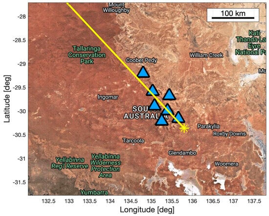 The first signal was detected at 17:31 UTC, with airwaves sweeping the arrays from the southernmost to northernmost one, indicative of shockwave propagation from the trajectory. The N-wave recorded by 27 out of 28 infrasound sensors resembled that of Hayabusa 1. The seismic signatures were captured as well [,]. The Hayabusa 2 SRC hypersonic re-entry also generated audible sounds at 18:32:15 UTC that were reminiscent of a mine blast as per observer reports on site as well as casual witnesses in the Coober Pedy township. This region was almost directly underneath the flight path of the SRC []. The amount of data collected allowed for a comprehensive analysis, including a 3D trajectory reconstruction based on infrasound detections [].