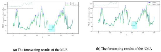 When comparing NSKEA, RNN, and LSTM, NSKEA emerged supreme. This suggests that contrasted with standalone models, a comprehensive learning model that dynamically selects the dataset’s beneficial features and adjusts the weak prediction model’s weight ratios using the proposed prediction mechanism, is more efficient. By being adaptable, the predictive model can deliver more accurate PM2.5 concentration forecasts.