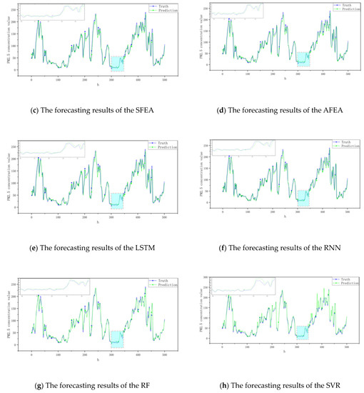 In this section, in order to prove the predictive superiority of our forecasting method, five existing air pollution forecasting models (RNN, LSTM, MLR, SVR, and RF) and three models given in 4.2.1 (NEA, SFEA, and AFEA) are compared with the proposed model. All models were tested using the data in Section 2.1, and the average error index data were obtained, as shown in Table 6.