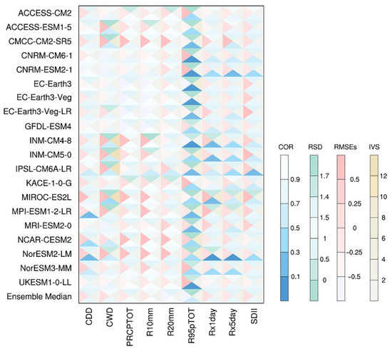 Statistical indicators of the ability of the sixth phase of the Coupled Model Intercomparison Project (CMIP6) models and their ensemble median to simulate extreme precipitation characteristics relative to CN05.1 observational data from 1985 to 2014. CDD: maximum number of consecutive dry days; CWD: maximum number of consecutive wet days; PRCPTOT: annual total precipitation; R10mm: count of heavy-rain days; R20mm: count of extreme heavy-rain days; R95pTOT: contribution of very wet days to total precipitation; Rx1day: maximum one-day precipitation; Rx5day: maximum five-day precipitation; SDII: precipitation intensity.