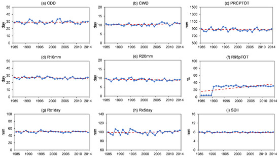 Temporal trends in the extreme precipitation indices simulated using the ensemble median of the CMIP6 models from 1985 to 2014. The blue plots represent the annual average time series of extreme precipitation indices, the indices order shown in (a–i) is as in Table 2, and the dashed red lines represent the linear regression model.