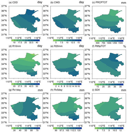 Figure 2 and Figure 3 delineate the spatiotemporal trends of the extreme precipitation indices in Henan during the historical period (1985–2014). Herein, CDD (CWD) represents the maximum number of consecutive dry (wet) days; PRCPTOT refers to the annual total precipitation; R10mm and R20mm are the extreme precipitation frequencies; and R95pTOT, Rx1day, Rx5day, and SDII are the extreme precipitation intensities. The interannual variations in CDD and CWD are relatively gentle, with an approximate inverse spatial distribution. The northeast is a high-CDD-value, low-CWD-value area, whereas the west is a low-CDD-value, high-CWD-value area. In particular, the longest dry spell in Henan can last 40 days (in the northeast), and the longest wet spell can last 15 days (in the west and south). PRCPTOT exhibits a slightly declining interannual variation during the historical period, with the southern region consistently showing high precipitation. R10mm and R20mm can last for ~30 days and 10 days, respectively, across the entire province, with their maximum values also situated in the south. However, R95pTOT did not reach the 95th percentile until before 1990, when it stabilized, and its high values are concentrated in the north. Overall, these results suggest that the changes in extreme precipitation events from 1985 to 2014 are not substantial, and the spatial distribution of extreme precipitation is heterogeneous.