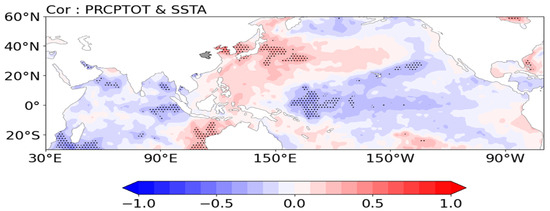 Correlation between PRCPTOT and sea surface temperature anomaly (SSTA). The black dots represent a 95% confidence level.