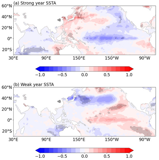 Synthesis results of SSTAs in Henan: (a) strong precipitation years; (b) weak precipitation years. The black dots indicate a 90% confidence level.