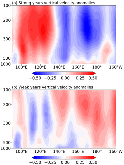 Synthesis results of vertical velocity anomalies in Henan (unit: m/s): (a) strong precipitation years; (b) weak precipitation years.