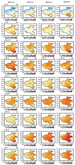 Under four scenarios (SSP1-2.6, SSP2-4.5, SSP3-7.0, and SSP5-8.5), the changes in the extreme precipitation indices of Henan simulated by the CMIP6 model ensemble median for 2041–2070 relative to 1985–2014. The black dots represent a 95% confidence level.
