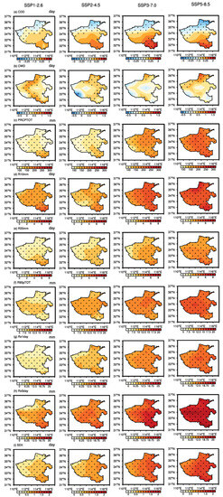 Under four scenarios (SSP1-2.6, SSP2-4.5, SSP3-7.0, and SSP5-8.5), the changes in the extreme precipitation indices of Henan simulated by the CMIP6 model ensemble median for 2071–2100 relative to 1985–2014. The black dots represent a 95% confidence level.