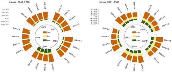 Henan, which is one of the most populous provinces in China, has a population of 98.72 million as of 2022. Extreme precipitation events in the context of global warming will expose more residents of Henan to various disasters, such as urban floods, floods, and landslides, posing greater threats to the local economy, life, and property. Therefore, the local government should estimate future changes in population exposure with regard to extreme precipitation events in order to implement appropriate adaptation and mitigation measures. Changes in population and extreme precipitation lead to changes in population exposure [22,23]. Changes in population exposure are jointly influenced by climate effects, population effects, and their synergistic effects. Equation (8) estimates the contribution of each component of population exposure (climate effects , population effects , and synergistic effects ) in different emission and population scenarios.