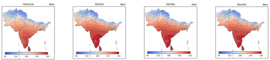 SU indices measure the annual number of days with a daily maximum temperature > 25 °C. Under four climate scenarios (historical, SSP245, SSP585, and G6sulfur), the mean annual SU indices had similar spatial distribution patterns, and their values in the south Indian peninsula would be much higher than other regions in South Asia (Figure 2, first row). Due to the influence of the high altitude, southwest monsoons, and Westerlies, the lowest mean annual SU indices would always appear on the southern slope of the Himalayas. Under a historical scenario (1985–2014), the mean annual average SU index in India would be approximately 240–312 days. Regardless of the implementation of SAI climate engineering, under the scenarios of SSP245, SSP585, and G6sulfur, the mean annual SU indices from 2030 to 2059 would reach at most 262–318 days in the Deccan Plateau of India, while, with the increase in altitude, the mean annual SU index on the southern slope of the Himalayas would rapidly decrease to 74–180 days.
