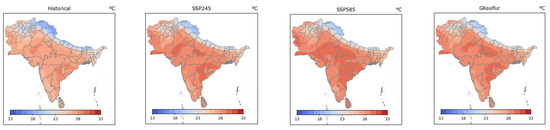 The TXx indices measure the annual maximum value of the daily maximum temperature. The spatial pattern of the mean annual TXx indices was similar under all four scenarios (Figure 4, first row). The Thar desert and its surroundings would always have much higher mean annual TXx indices than other regions of South Asia. With the increase in altitude, the lowest mean annual TXx index would always appear on the southern slope of the Himalayas. Under a historical scenario (1985–2014), except for northern Himalayan regions, the mean of the annual TXx indices in South Asia was approximately 30.5–40.9 °C (Figure 4, first row). Under the SSP245, SSP585, and G6sulfur scenarios, the mean annual TXx indices during 2030–2059 would have no significant difference, and the largest value would reach 35.4–42.1 °C in the western borders of South Asia and the lowest value would decline to 26.8–34.1 °C on the southern slope of the Himalayas. Since the warm South Asian monsoons are blocked by the Himalayas’ ranges, the southern slope of the Himalayas would demonstrate stronger warming effects during future scenarios (SSP245 and G6sulfur), while the Deccan Plateau would demonstrate weaker warming effects due to its adjacency to the Indian Ocean and relative high altitudes. Under the SSP245 scenario (2030–2059), the mean annual TXx indices in Kashmir would be predicted to be 1.7–3.2 °C higher than the mean in the historical period (1985–2014), while these indices in the Deccan Plateau would be predicted to be only 0.3–1.6 °C higher. Under a G6sulfur scenario (2030–2059), the mean annual TXx indices in Kashmir would be predicted as 2.1–4.1 °C higher than those during 1985–2014, while the indices in the Deccan Plateau would be only 0.1–1.9 °C higher (Figure 4, first row). Compared with an SSP245 scenario, the G6sulfur scenario would increase the mean annual TXx indices on the southern slope of the Himalayas by 0.2–0.9 °C and in Kashmir by 0.3–0.8 °C. Due to adjacency to the Indian Ocean, the mean annual TXx indices in the southern Deccan Plateau were predicted to increase only by 0.1–0.2 °C. Compared to a SSP585 scenario, during 2030–2059, the G6sulfur scenario was predicted to decrease the mean annual TXx indices in most of the South Asian regions by 0.1–0.4 °C and increase them by a similar magnitude in the Indus river plain and Afghanistan.