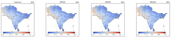 The CWD indices measure the maximum number of consecutive days when precipitation is ≥1 mm. Under four scenarios, affected by southwest monsoons, the largest value of the mean annual CWD indices would appear in the western Deccan Plateau (up to 60 days). The minimal value would appear in the Thar desert, Afghanistan, and Kashmir (about 10–14 days) (Figure 11, first row). Compared with the historical scenario, the mean annual CWD indices under the SSP245 scenario would be predicted to be 2–4 days higher in the eastern Deccan Plateau, 1–2 days higher in the Thar desert, Indus river plain, Afghanistan, and Kashmir, and 1–2 days lower in the western Ghats and near the Ganges Delta. This is similar to the difference between the G6sulfur and historical scenarios. The mean annual CWD indices under the G6sulfur scenario would be predicted to be 1–2 days less than those in SSP245 scenario in most regions in South Asia, but 2–3 days larger in the western Ghats. Compared with the SSP585 scenario, the G6sulfur scenario would decrease the mean annual CWD indices in most South Asian regions by 0–2 days, and the largest decrease would appear in the south end of the Deccan Plateau.