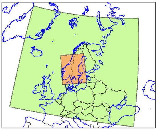 The meteorological fields used to force the MATCH model are from the operational weather forecasting model (IFS) of the European Centre for Medium-Range Weather Forecasts (ECMWF). These model results, with a temporal resolution of three hours, were then interpolated for the two domains shown in Figure 1. For the European domain, the data were based on Corine land cover with adjustment to EMEP classes (described in Simpson et al., 2012 [22]), while for the smaller domain, which covers the county of Jämtland Härjedalen, the land-use classes were updated using the 2012 Corine land cover dataset. To separate the contribution of total PM2.5 from wildfire emissions, two sets of simulations were carried out on the nested domain for June–August 2018, which means that one set includes wildfire emissions from GFAS, while in the other set, these emissions are masked over a region covering almost all of Sweden.