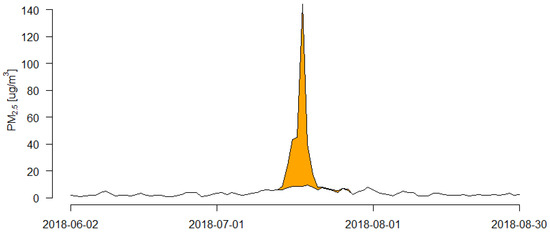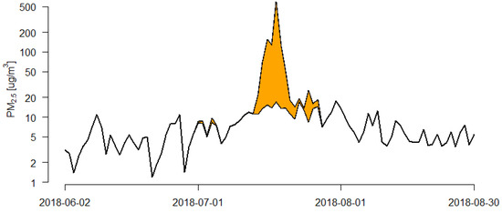 Illustration of the simulated PM2.5 exposure data (mean of 1 h maximum per day) with wildfire-generated concentrations highlighted in orange (logarithmic y-axis).