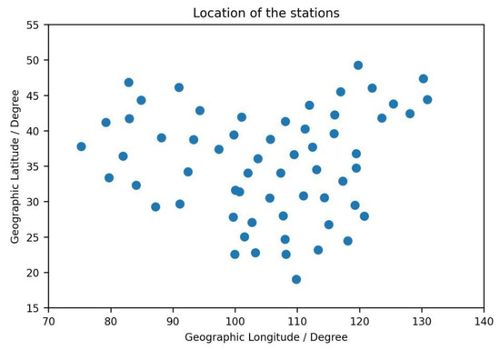 We analyze the day-to-day changes from 2012 to 2018 above the East Asian region with the TEC from 60 GNSS continuously operating reference stations of the CMONOC (Crustal Movement Observation Network of China) network, which are relatively evenly distributed in China, as shown in Figure 1. The distribution of these stations, which is used for the calculation of TEC, has not changed in these years. In this case, we use the Bernese GNSS software to realize the calculation of TEC. The coverage area of the regional model is [70° E–140° E, 15° N–55° N], and the spatial resolution of TEC is 1 degree in geographic longitude and 1 degree in geographic latitude. The sample time is 2 h. The TEC calculated from Bernese GNSS software on a regional scale has been compared with the GIM (Global Ionospheric Map) from CODE (Center for Orbit Determination in Europe) and other global ionospheric maps in many references, e.g., [11,12,13]. The Bernese GNSS Software is a scientific, high-precision, multi-GNSS data processing software developed at the Astronomical Institute of the University of Bern (AIUB). It is used by CODE for its international (IGS) and European activities. The GNSS stations supply the measurements of the pseudorange and the carrier phase at the two working frequencies of GNSS. We can obtain the pseudorange TEC (STECr) and phase TEC (STECp) along the path from a satellite to a receiver from Equation (1):