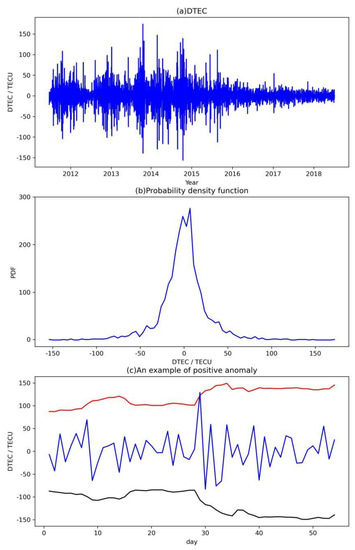 Then, we analyze the abnormal variation of the day-to-day TEC change using . These anomalies are the extremely large (positive) or small (negative) values of DTEC in these years. We show an example of a positive anomaly in Figure 2c. To determine whether the is an extreme value (anomaly), we collect the data 27 days before the index at the same geographic point and universal time. For example, we collect the DTEC 27 days before at [101°E, 51°N] and UT 12 to form a sliding window. The sample data in this sliding window are used to determine the upper limit and the lower limit. The mean value of these sample data in the sliding window is denoted as , and the standard deviation of these sample data is denoted as σ. When we find an index () larger than (upper limit) or less than (lower limit), we consider that an anomaly of day-to-day TEC variability occurs. We treat the larger than as a positive anomaly, and less than as a negative anomaly. We can see a positive anomaly in Figure 2c.