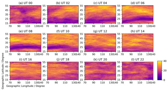 We use the data from 2012 to 2018 to determine the anomalies of day-to-day TEC variability in the way described in Section 2, and then sum up the count of the anomalies in each temporal and spatial bin in these years. The amount of positive and negative anomalies in each bin is used to show the temporal and spatial distribution. The change in temporal and spatial distribution of positive and negative TEC anomalies is shown in Figure 3 and Figure 4. The positive anomaly occurs frequently in the middle latitude (about 30° N~55° N) at UT 06–16, which is about LT 14–20, and occurs more frequently around 28° N at UT 14–18, which is mainly at about LT 22–00, as shown in Figure 3. The negative anomaly occurs more frequently at middle latitude at UT 02–18, as shown in Figure 4. They obviously occur less frequently at low latitudes (about 15° N~30° N) at UT 00–04, which is LT 08–12, and less frequently near the Equator Ionization Anomaly area (about 22° N~30° N) at UT 06–12, which is mainly at LT 14–18.