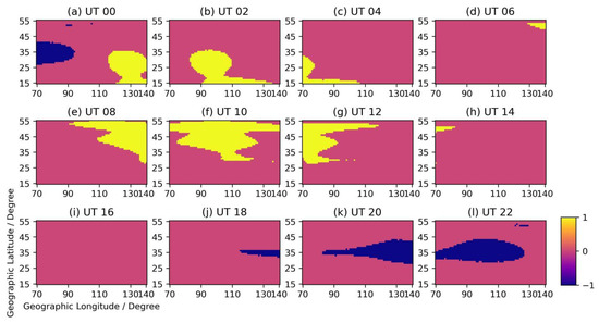 When we investigate the change in TEC anomaly, we firstly observe the spatial distribution of TEC anomaly in each temporal bin, then we check the differences in the spatial distribution of TEC anomaly over a continuous period of time. There is an interesting phenomenon: sometimes the anomaly of TEC day-to-day variation seems to be moving. For investigating the spatial distribution of anomalies at each temporal bin, we make an anomaly map in which the positive anomaly at each location is denoted as “1”, the negative anomaly is denoted as “−1”, and the location without anomalies is denoted as ”0”. Then we put 12 maps from the same day in a figure. An example is shown in Figure 5. This is the anomaly map for 5 March 2012. We can see that the shape of the anomaly at the adjacent time window looks similar. This kind of phenomenon occurs many times. It indicates that some anomalies are moving instead of staying at a fixed location.