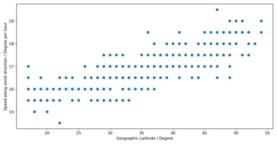We found 850 moving TEC anomalies from 2012 to 2018, including 413 positive anomalies and 437 negative anomalies. The quantities of positive anomalies and negative anomalies are comparable. The direction of movement is from east to west in a zonal direction in all conditions. We think that the moving anomaly that we detected might be correlated to the rotation of the Earth. The anomalies may move with the Sun and have a slightly different speed relative to the Earth. We analyze the speed, temporal, and spatial distribution of the front of the moving anomalies. We obtain the speed by comparing two spatial distribution figures of anomalies with continuous time. The anomalies have characteristic points as shown in Figure 5, such as [110° E, 44° N] in Figure 5e and [76° E, 43° N] in Figure 5f. We calculate the longitudinal distance between these points, and it is 34°. The interval is 2 h. The speed is the longitudinal distance divided by the interval, and it is 17° per hour in this example. It is a rough estimate, and we find that the speeds are around 15~19 degrees per hour in the zonal direction. The moving anomalies may occur in each temporal bin with similar probability. They are nearly evenly distributed in geography by longitude and occur more at middle latitudes. There is another interesting phenomenon: the speed of moving anomalies seems to grow as the latitude increases, as shown in Figure 6.