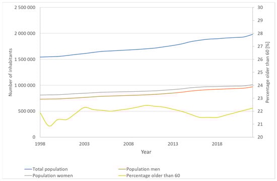 From 1998 to 2022 the total population of Vienna increased from 1,542,252 inhabitants to 1,982,097 inhabitants (Figure 1). The female population grew from roughly 811,000 to over 1 million. The proportion of women however slightly decreased from 52.6 to 51%, whereas the percentage of the Viennese population aged 60+ only changed from 21.89% to 22.24% with an intermediate maximum at 22.45% in 2010. The number of 60+ inhabitants grew from roughly 337,700 to 440,870. In the first step, we analyzed the absolute number of deaths during hot and normal days. In the second step, these data were related to the number of inhabitants by calculating a death rate (number of daily deceased per 100,000 inhabitants). It is well known that the older population is more vulnerable to heat stress than the younger persons, an initial assessment of a possible influence of the age structure on mortality trends was therefore performed by analyzing the yearly changes in the proportion of the Viennese population older than 60 years using a Mann–Kendall test. The numbers obtained showed no significant trend (p value 0.62) which leads us to the conclusion that fluctuations in the proportion of older people might lead to some yearly fluctuations but not to any trends in mortality. Further analysis was however also performed (see Section 3).