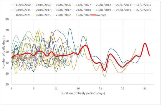 Daily number of deceased as a function of the duration of the heat wave. Mortality data of 18 heat waves with a duration longer than 10 days were used. The day of the beginning of the heat waves is indicated in the legend.