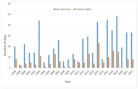 Number of hot spell days and tropical nights per year for the period of 1998 to 2022.