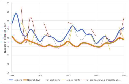 Figure 5 shows the average of daily deaths for the months of May to September for each year of the period 1998 to 2022. The number of deaths is almost for all the years lower on normal days. Statistical significance using the Wilcoxon test showed that the number of deaths during hot days (average 47.4; p-value 2.92 × 10−7), hot spell days (average 45.41; p-value 3.86 × 10−5), and days with tropical night conditions (46.61, p-value 0.0036) were significantly higher than on normal days (average 41.92). The highest mortality was observed at the beginning of this 24-year period (1998–2004).