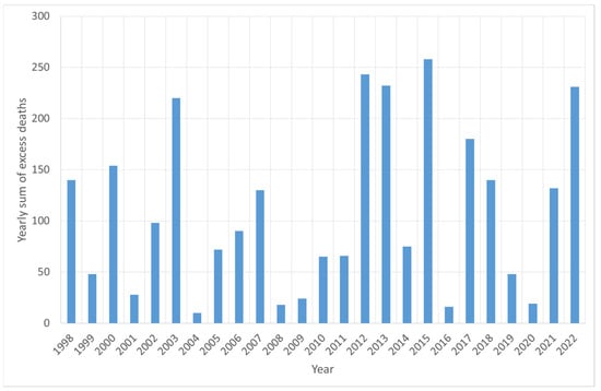 Figure 6 shows the sum of excess daily deaths per year. In some years almost no excess heat-related deaths may be observed (e.g., 2004: 10 deaths, 2008: 18, 2009: 24, 2016: 16, 2020: 19). On very hot years the sum of heat-related deaths amount to 220 (the year 2003), 243 (the year 2012), 232 (2013) and 231 (2022). Statistical analysis concerning a possible trend using the Mann–Kendall test was negative, with a p-value of 0.55. The explanation lies probably in the fact that on one side the population is adapting to heat stress by changing its behavior, but on the other side, there is a steady increase in the number of hot days.