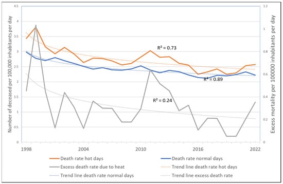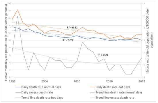 As can also be seen in Table 1, the results obtained for 1998 and 1999 showed rather high death numbers. This applied to hot days and normal days as well. The mortality rate continued to decrease until the end of the first period and then remained relatively constant for several more years. After 2010 there was a slight increase, which, however, stopped a year later and was reduced again. In 2019 and 2020, the death rates on hot and normal days were almost similar with a difference in daily deaths of 0.05 per 100,000 inhabitants. In the years after 2020, the difference in mortality between hot and normal days increased again. A connection with the COVID-19 (SARS-CoV-2) pandemic was not analyzed in this work.