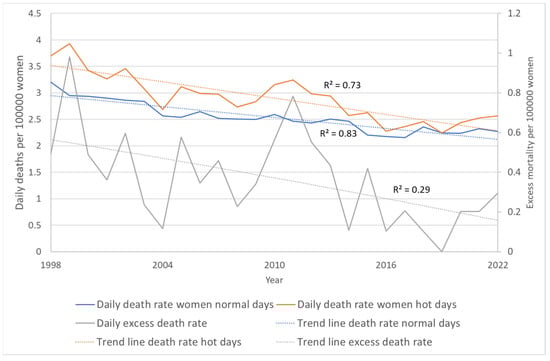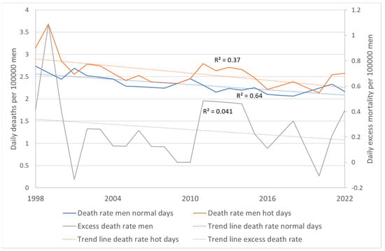 Next, we investigated mortality per 100,000 female or male inhabitants. Figure 9 shows the yearly average of daily mortality of women per 100,000 female inhabitants. The same characteristic features as for the total Viennese population may be seen. A statistically significant decrease in average daily deceased on normal days is shown (p-value 3.52 × 10−8, R2 = 0.83, slope = −0.032). On hot days, a significantly decreasing trend in daily mortality is also obtained (p-value 3.32 × 10−6, R2 = 0.73) with a slope of −0.051. The excess mortality (heat-related mortality) also shows a larger fluctuation and a lower correlation coefficient of R2 = 0.2056. The Mann–Kendall test indicates a statistically significant decreasing trend (p-value 0.0035 with a slope of −0.015).