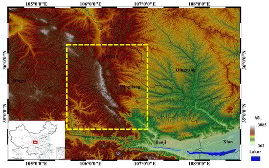 Geographical location and terrain of the Liupan Mountains (LMs). The LMs are located within the area delineated by the yellow dashed box. (From He et al. []).