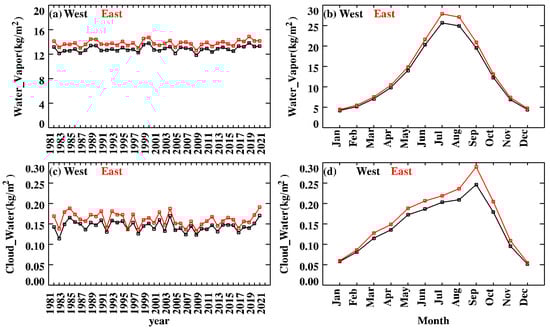 Clouds and water vapor are essential components of the atmospheric water cycle and have a profound impact on regional climate and weather. In Figure 3, a comparison is made between the annual mean and monthly mean sequences of TCWV and TCCW for the 40-year period from 1981 to 2020. It is observed that the 40-year average TCWV on the eastern side is 13.8 kg/m2, which is approximately 7% higher than that on the western side. The higher values are mainly concentrated in the months of June to September, with an average of 24.4 kg/m2 on the eastern side, approximately 8% higher than that on the western side. The maximum TCWV occurs during the dominant summer monsoon in the months of July and August, with the eastern side exhibiting approximately 9% higher values than the western side. Comparing the distribution characteristics of columnar TCCW in Figure 3c,d, it is evident that the monthly sequence differs significantly from the TCWV. The high values of TCCW mainly occur from May to October, with the maximum value observed in September. The eastern side exhibits approximately 18% higher values in September compared to the western side. Therefore, it can be concluded that during the peak season of the summer monsoon and months with higher TCWV, the difference in TCWV between the eastern and western sides becomes more pronounced. The monthly distribution of TCCW differs significantly from that of TCWV, with the highest values occurring in September. Differences in the monthly average distribution throughout the year between the TCCW and TCWV is closely associated with cloud precipitation processes. Especially, during the summer monsoon season in July and August, the water vapor content reaches its maximum value throughout the year, indicating that clouds are more likely to develop into rainfall during this period. Therefore, the cloud water content in September, when the summer monsoon weakens, is unexpectedly higher than in July and August.