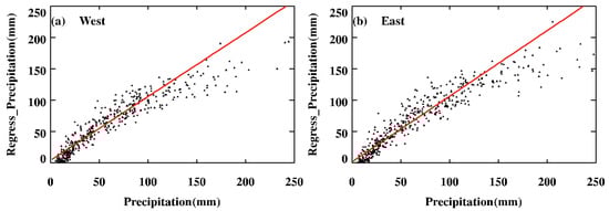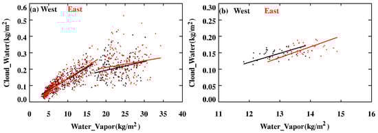 Considering the above characteristics, it is possible to quantify the relationship between TP and both integrated TCWV and TCCW. By using linear regression, Equations (1) and (2) can be derived to represent the relationships between TP, TCWV, and TCCW in the eastern and western sides, respectively.