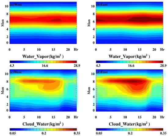 The seasonal variation in cloud water and water vapor is mainly influenced by the air mass transport during the cold and warm seasons. The air coming from the north carries less water vapor, while the air from the southern direction carries more water vapor. In the cold season, there is a higher influx of air from the north, while in the warm season, there is a higher influx of air from the south. Cloud formation not only depends on sufficient water vapor content but also requires suitable dynamic conditions to transport the water vapor to the lifting condensation level for cloud and precipitation formation. Therefore, in Figure 4, there is a significant difference in the distribution of cloud water between the early morning and afternoon times compared to the distribution of water vapor. From Figure 5a,b, and Figure A1 it can be observed that the daily variation of TCWV on the eastern side is more pronounced compared to the western side, with longer durations of high values, especially during the summer. Influenced by water vapor, the high-value area of TCCW on the eastern side is consistently higher than that on the western side during the morning and afternoon (see Figure 5c,d). Zhang et al. [] conducted a study on the cloud parameters in the LMs using ERA5 data and found that the cloud fraction in the mountainous areas during spring, summer, and autumn afternoons exceeded 70%. Tian et al. [] utilized microwave radiometer observations from the Longde station in the LMs for the period of June to November 2017 and discovered that the high values of atmospheric TCWV occurred during the midday to evening period, with peak values of liquid water content appearing before sunrise, in the afternoon, and in the evening, with the most prominent peak appearing in the afternoon. These research findings are consistent with the statistical results shown in Figure 5c,d. Hence, it can be concluded that there are significant differences in the daily distribution of TCWV and TCCW between the eastern and western sides of the LMs. The high values of cloud water resources on the eastern side persist for a longer duration during the day and involve more months compared to the western side.