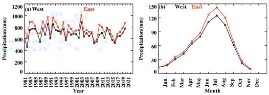 Comparison of the precipitation between the eastern and western sides of the LMs over a span of 40 years, from 1 January 1981 to 31 December 2020, based on ERA5 data. (a) The monthly average series for the 40-year period, (b) the 12-month average series.