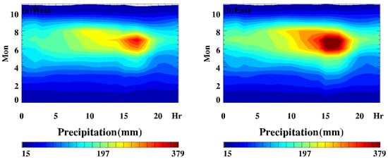 The 24-h daily distribution of average monthly precipitation in the LMs, obtained from ERA5 data spanning 40 years from January 1981 to December 2020. The x-axis represents the hours of the day, while the y-axis represents the 12 months of the year. (a) represents the western side, (b) represents the eastern side.