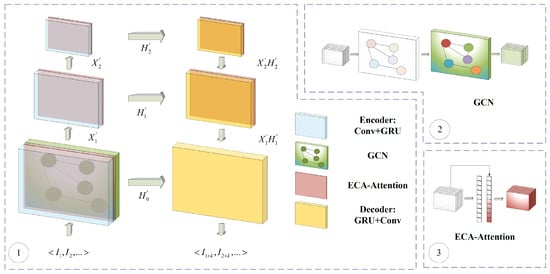 Compared with the traditional time series prediction problem, meteorological data can be viewed as image data. Therefore, some studies have introduced a learnable convolution as an image feature extractor to extract the high-level semantic information of the image. This semantic information is then imported into the recurrent neural network for learning. Finally, the predicted features are decoded and up-sampled to obtain predicted image information. The model mainly adopts the encoder–decoder architecture for feature extraction and remapping. The slice of meteorological time series data in each space can be regarded as a kind of image data with uneven distribution. Convolutional layers are better at extracting features in Euclidean space due to the specific shape of their convolution kernels. Graph convolution has a strong ability to represent features. It can construct topological structure information of semantic features, map traditional image features to graph structure information, and build feature associations to achieve more accurate feature extraction.