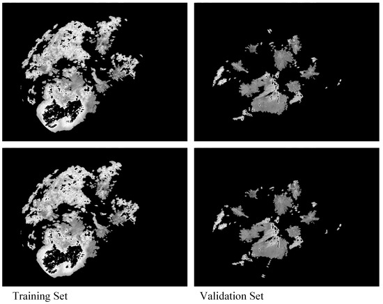 The Guangxi constant altitude plan position indicating (GCAPPI) dataset is a high-time resolution record dataset of cumulonimbus cloud distribution in Guangxi province, China. The research area covers (102–114 E, 19–28 N). The experimental data consist of radar maps collected by 10 Doppler radars in Guangxi. The radar data are sampled and processed by the severe weather analysis and prediction system (SWAN) of the China Meteorological Administration to form a gridded reflectivity factor isosurface mosaic, with a horizontal resolution of and an altitude spectrum ranging from to km. In order to avoid ground interference and improve the reliability of data [], the quality control algorithm was applied to remove isolated noise and ground echoes []. Specifically, the algorithm identified and removed echoes with low reflectivity values and those that were not contiguous with other echoes []. This step helped to reduce the impact of non-meteorological echoes on the analysis. We selected the radar maps from June 2019, with a time resolution of 6 min. The original radar echo data are stored in bin format as echo data with amplitudes ranging from −128 to 127. To better form image information, we rescale the amplitudes to the range of 0 to 255. In addition, to avoid noise and abnormal values affecting the feature extraction process, we use the Daubechies8 wavelet for filtering. This results in a radar echo image with a size of . The GCAPPI dataset contains a total of 7200 frames, which were separated into a 6:4 training set and testing set, i.e., the GCAPPI dataset includes a training set of 4320 frames and a validation set of 2880 frames. To improve the operation speed, we resized the radar map size to . Examples of the GCAPPI dataset are presented in Figure 3.