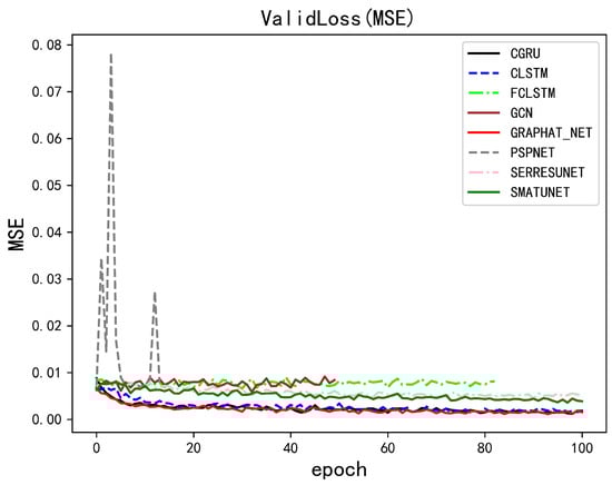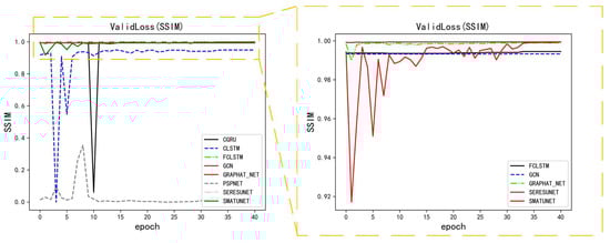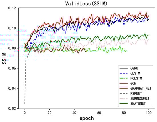 In addition, we present the performance of different models on the moving MNIST dataset in Figure 4 and Figure 5, respectively. Limited by the ability of different models, PSPNet, GCN, and FC-LSTM triggered the early stopping mechanism. Evidently, GraphAT-NET outperforms the other models in both the mean squared error (MSE) and structural similarity index (SSIM) metrics. Firstly, GCN performs the worst, possibly because it cannot extract spatio-temporal feature information from sequence data alone. Additionally, fully CNN-based models such as PSPNet, Seresunet, and Smatunet, which use CNN to construct spatio-temporal feature correlation information, still do not achieve as high prediction accuracy as models that combine CNN and RNN. Furthermore, as a typical machine learning method, FC-LSTM is not sufficient to learn feature representations from the moving MNIST dataset. Comparing the models, Convlstm, Convgru, and the proposed model show significantly improved accuracy compared to other models. This may be because CNN can extract feature information from images, and RNN can build spatio-temporal feature information based on the correlation between image features. Additionally, Table 1 shows that the proposed model achieves the highest accuracy.