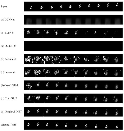To better demonstrate the advantages of the proposed model, we display the visualization results in Figure 6, following the order of Table 1. It is evident that GCN can only achieve fuzzy predictions of the region, which is consistent with the previous speculation that an image-sensitive CNN structure is necessary to extract image details. Notably, FC-LSTM learned nothing but the background and failed to make any predictions in the moving MNIST dataset. Furthermore, in the visualization results of PSPNet, Seresunet, and Smatunit in Figure 6, the short-term prediction results are better and clearer, while the long-term distribution becomes fuzzy and more disturbed. This may be because it is difficult for the model to build the spatio-temporal feature association relationship, making it challenging for the model built only by CNN to make long-term predictions. Compared with ConvLSTM, ConvGRU, and the proposed model results, it is apparent that the architecture built by CNN and RNN can better extract spatio-temporal feature information and make more accurate predictions. However, the prediction results of ConvLSTM and ConvGRU still contain a lot of interference, which affects the prediction results. Additionally, it can be observed that the prediction accuracy of all models decreases with time. Nevertheless, it is evident from the visualization results that the proposed model achieves the best prediction accuracy.