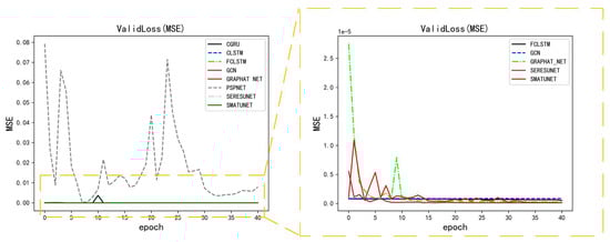 We demonstrate the performance of the compared algorithms on the CAPPI dataset over time in Figure 7 and Figure 8. Due to hardware limitations, the training epoch of CAPPI is 40. Early stopping is not used in the CAPPI dataset experiment. It can be observed that PSPNet is ineffective in training on the CAPPI dataset. To better illustrate the training details, we excluded the loss curves of PSPNet, CLSTM, and CGRU and displayed the detailed plots on the right side of Figure 7 and Figure 8. It can be seen that GCN, FC-LSTM, SERESUNET, SMATUNET, and GraphAT-NET perform similarly at the end of training, making it difficult to compare them intuitively based on loss values.